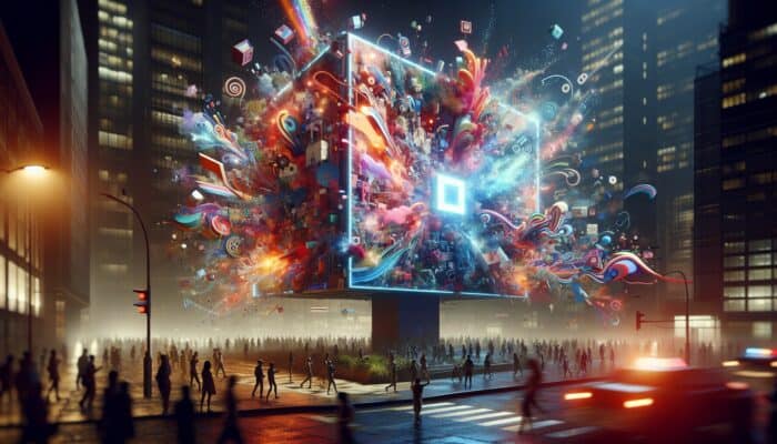 Creating YouTube Bumper Ads for Hosting Impact: A vibrant digital billboard showing a 6-second YouTube bumper ad, engaging viewers amidst cluttered content.